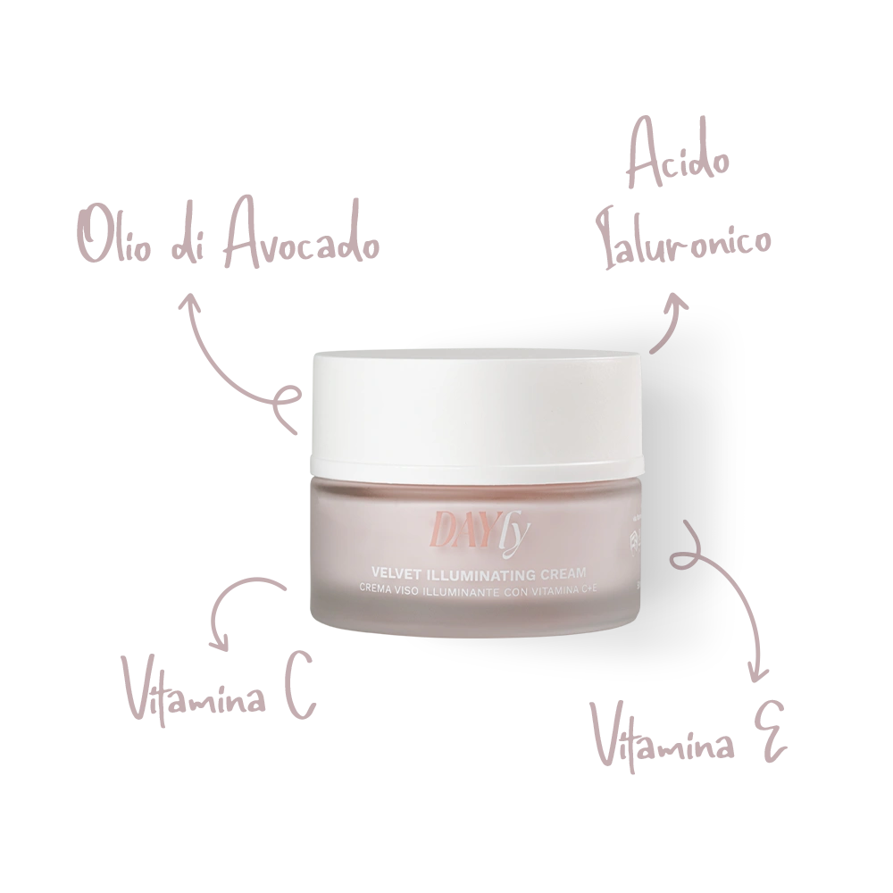 VELVET ILLUMINATING CREAM è la crema viso da 50 ml che combina la potenza delle Vitamine C ed E a una texture vellutata e soffice che si fonde con la pelle, senza appesantire.